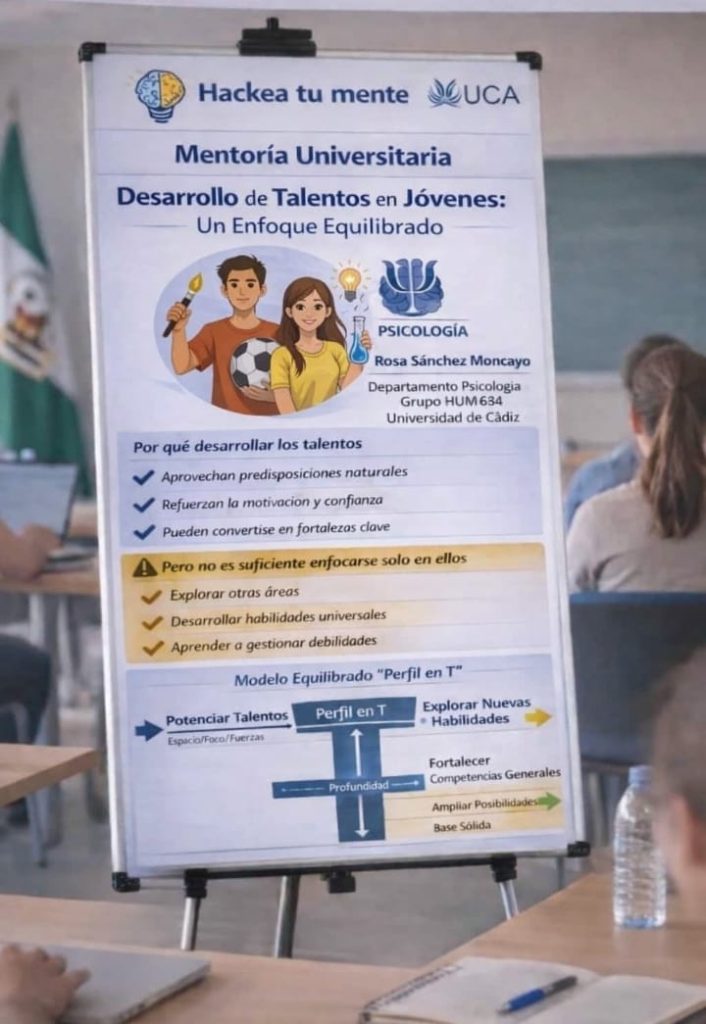 La profesora e investigadora Rosa Sánchez Moncayo, del Grupo HUM 634, ha participado en la Mentoría Universitaria con la propuesta titulada “Hackea tu mente: claves para sentirse mejor y pensar más alto”, desarrollada en colaboración con el Equipo Especializado de Altas Capacidades de la Junta de Andalucía.